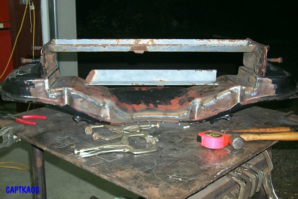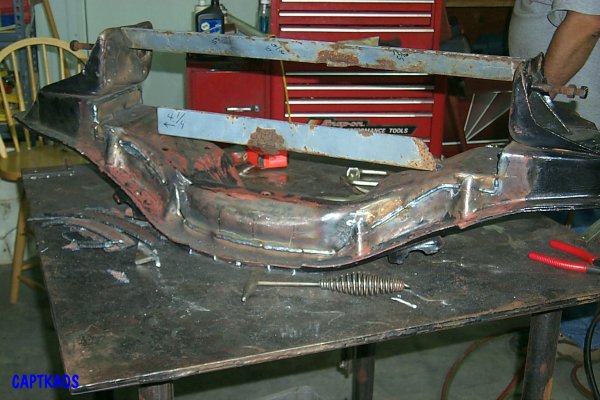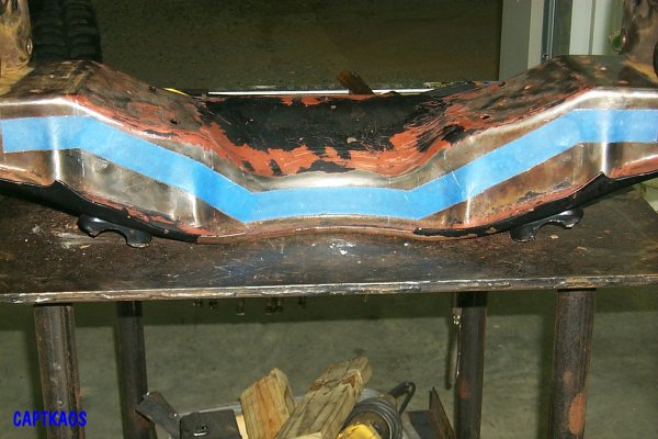 Since I no longer do this except on special occasions (Toolmaster did all the welding), here is the secret to Captkaos' Chopped Crossmembers for quickly marking up a stock crossmember for cutting that allows both pieces to be easily mated back together without a lot of weld filling. You will need 2 filler plates for the end sections cut to fit inset in the opening.