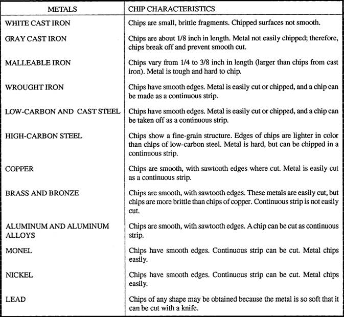 Another simple test used to identify an unknown piece of metal is the chip test. The chip testis made by removing a small amount of material from the test piece with a sharp, cold chisel. The material removed varies from small, broken fragments to a continuous strip. The chip may have smooth, sharp edges; it maybe coarse­grained or fine-grained; or it may have sawlike edges. The size of the chip is important in identifying the metal. The ease with which the chipping can be accomplished should also be considered. The information given in table 1-4 can help you identify various metals by the chip test.